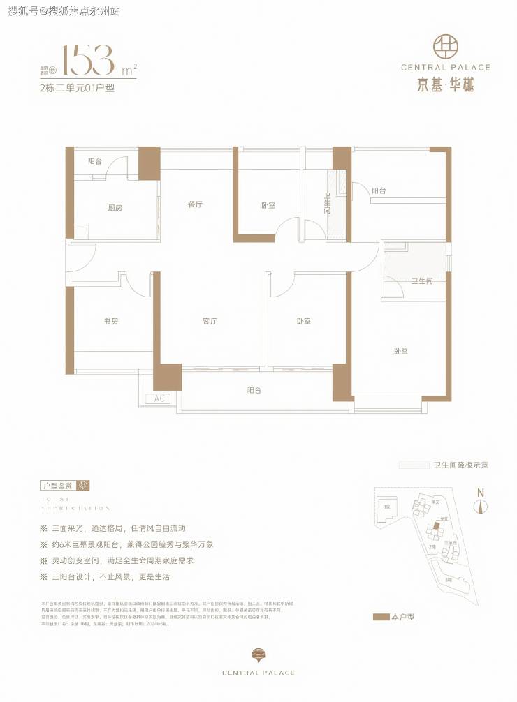 居住品质丨户型设计:主推95-222㎡三至五房,采用竖厅格局、LDKB 一体化设计,得房率约 73%,部分户型配备 6 米大阳台和全屋飘窗。