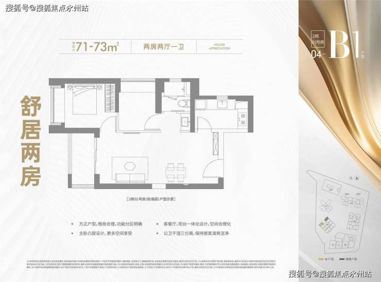 71-73㎡的2房2厅1卫,设计的是竖厅格局,客厅开间3.2米,西南跟东北向。