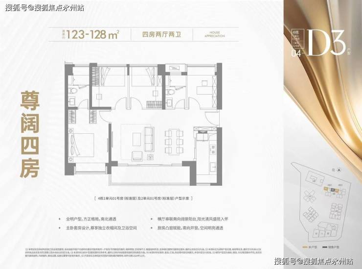 123-128㎡的4房2厅2卫,设计的是横厅南北通透格局,客厅开间6.6米,正南,东南跟西南朝向。