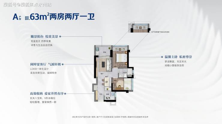 63㎡两房两厅一卫(稀缺小户型)设计特点:竖厅格局,LDKB一体化(客厅+餐厅+厨房+阳台),U型厨房,S墙预留双开门冰箱位;全屋飘窗+干湿分离卫生间,西北朝向阳台。