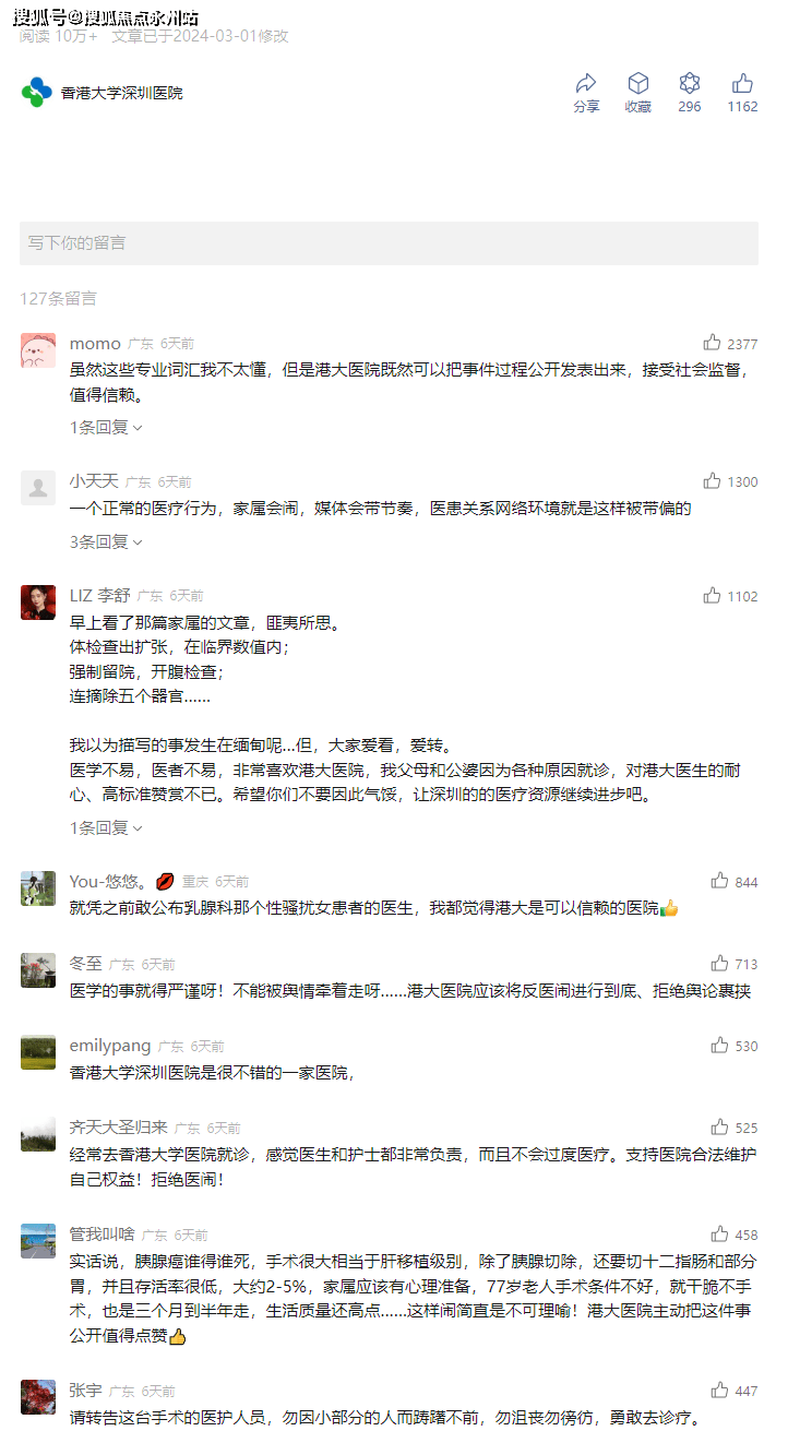 其中港大医院口碑近期越来越不错,就在前面几天某女士医疗事件,港大医院正面回应,收获了10w+个阅读和非常多的点赞。