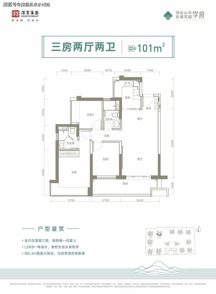 101㎡的3房2厅2卫,设计的是经典竖厅格局,进门入户玄关,客厅3.6米开间,LDKB一体化设计,三开间朝南,3个卧室,U型厨房,卫生间干湿分离,西南或东南朝向。