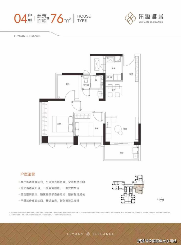 76㎡三房两厅一卫:竖厅格局,三开间朝南,东南朝向;三段式干湿分离卫生间,二字型厨房;赠送后得房率约94%。