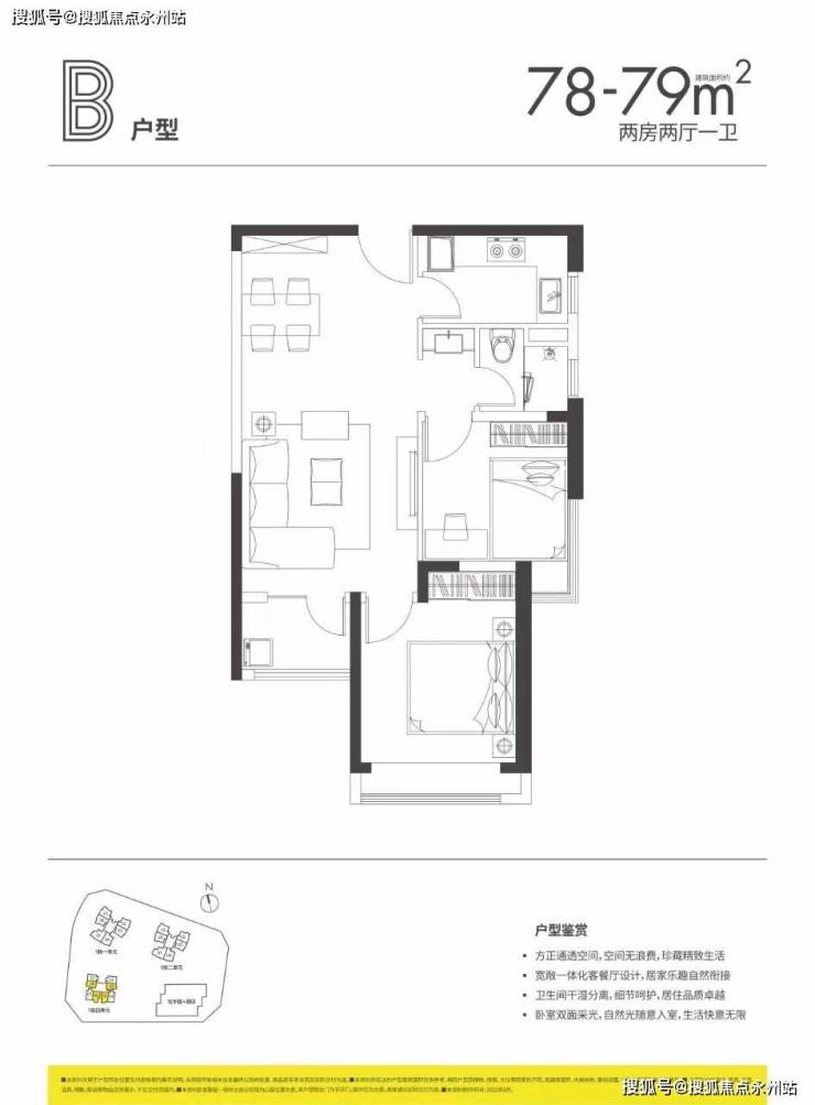 B户型:建筑面积约77-79㎡两房一卫;
