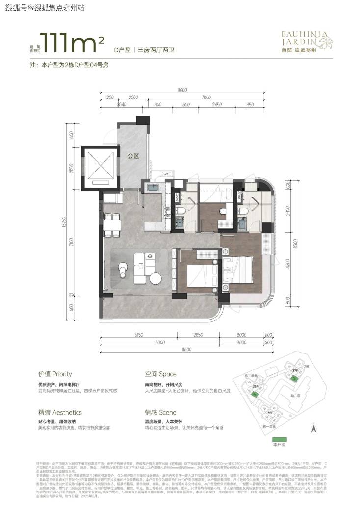 111㎡的3房2厅2卫,2栋05户型,设计的是竖厅格局,专梯入户有送约5.7㎡的独立公区,客厅5.15米开间,超宽客厅,LDKB一体化设计,动静分区,三开间朝南,主卧大套间无柱弧形270°转角飘窗,3个卧室分别做到了主卧17.64㎡/次卧9.12㎡/次卧8.57㎡(包含墙体飘窗),客厅连接次卧出8米长的观景大阳台,U型厨房,卫生间干湿分离,得房率约76.7%(不含赠送),西南朝向。赠送面积18.56㎡(不含公区),加上赠送后得房率约93.65%。