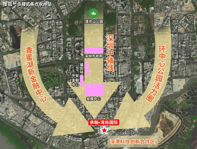 承翰湾尚国际庭玺雄踞福田天赋正脉,北源莲花山,直抵深港合作区,位于城市中轴线的“点睛”之处。