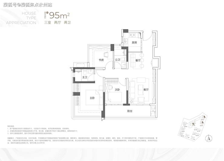 95㎡3房2卫-该户型为西南向(部分户型看海)或东北向看山景,是传统的竖庭格局,南北通透。最大亮点是,阳台从客厅对出连通到次卧,显得比较宽敞。特别是对于三代同堂的家庭,适合老人早期锻炼。