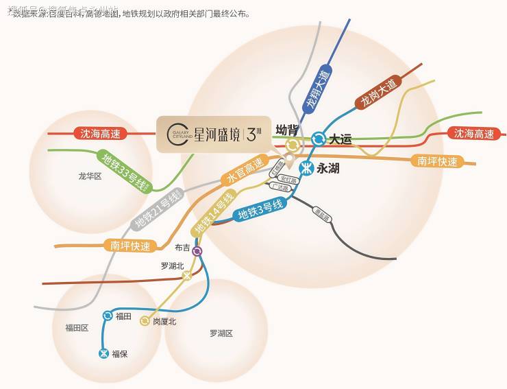 地铁:3 号线永湖站(步行约 500 米,10 分钟)、14 号线坳背站(步行约 1.1 公里,15 分钟),2 站直达大运枢纽,5 站至罗湖,6 站至福田。