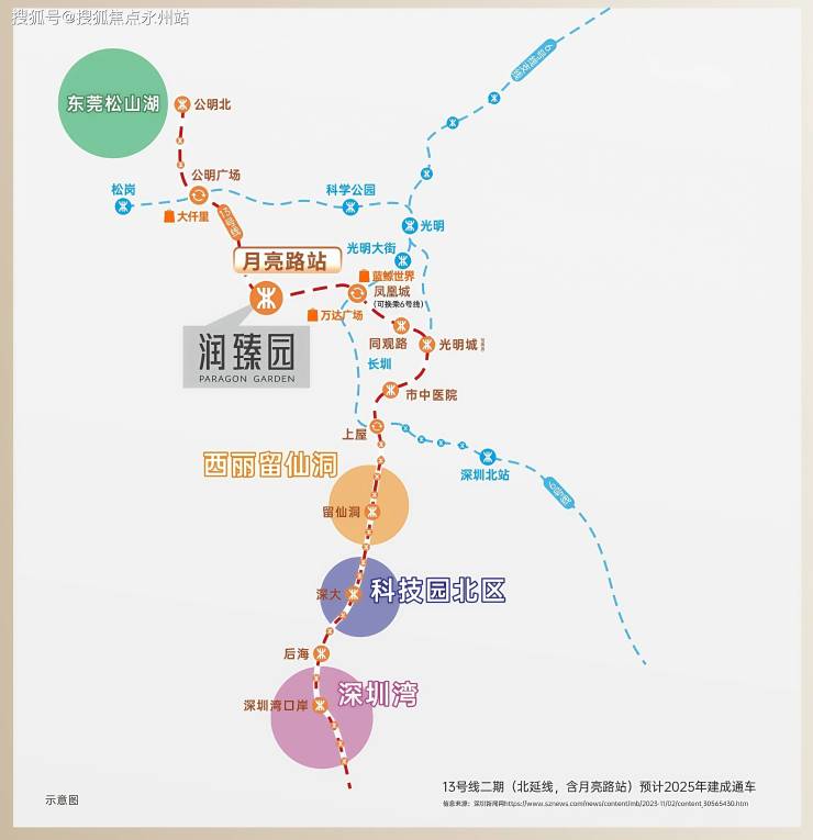 项目家门口是主干道松白路,自驾半小时可达南山,周边还有南光高速、龙大高速、深圳外环高速等交通要道,13号地铁线”月亮路站“距离约300米,目前还在建设当中,预计在2025年底-2026年初开通运营,1站直达凤凰城换乘6号线,3站至光明城高铁站,未来通过13号线可快速连接南山科技园、后海总部等核心区域,未来该线路将延伸至东莞松山湖,并接驳29号线(规划中),形成大湾区黄金轴线。
