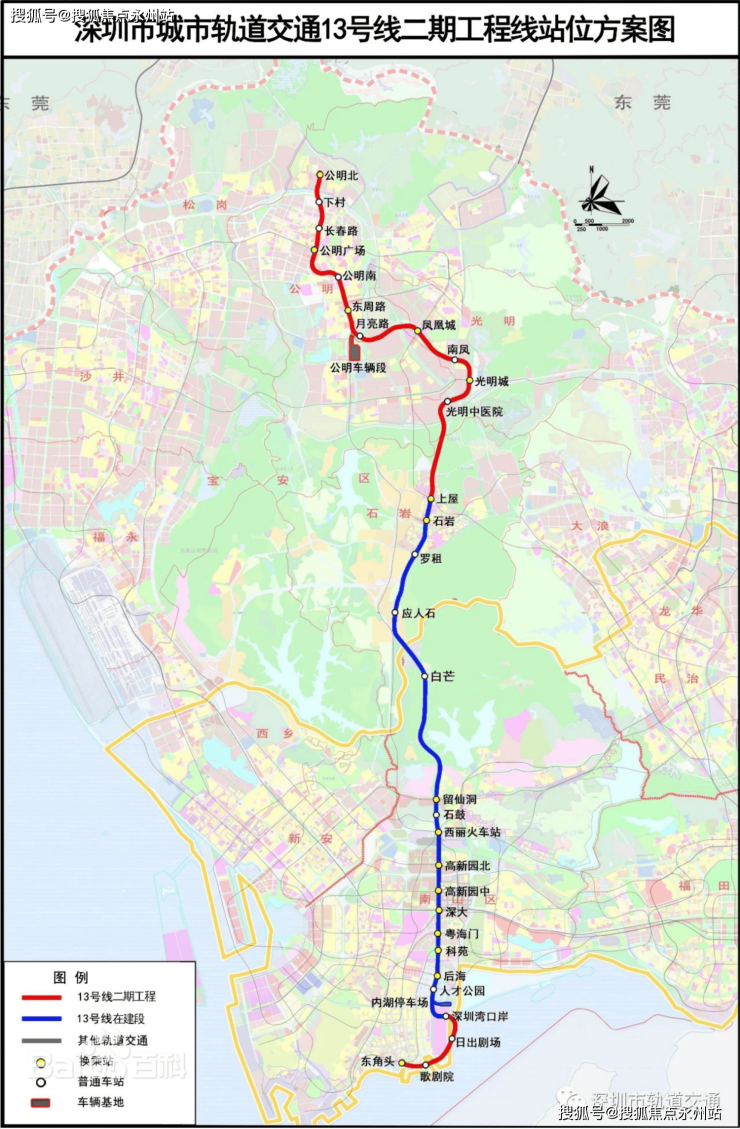 ①13号线及其南、北延长线(建设中,预计2025年开通)起于东角头站,终于公明北站,纵贯光明、宝安、南山,线路开通后约30分钟可抵达南山核心区,约45分钟可达深圳湾口岸,以高新技术人才为主要客流,被称为高新技术人才专线