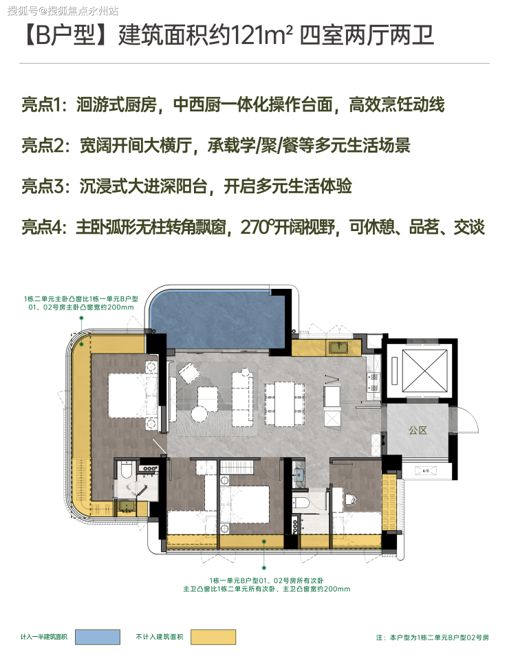 121平4房2卫:独立电梯厅入户,横厅布局,开放式厨房,餐客厅一体,空间感更明显,四房适合多人口家庭,东南、西南朝向。