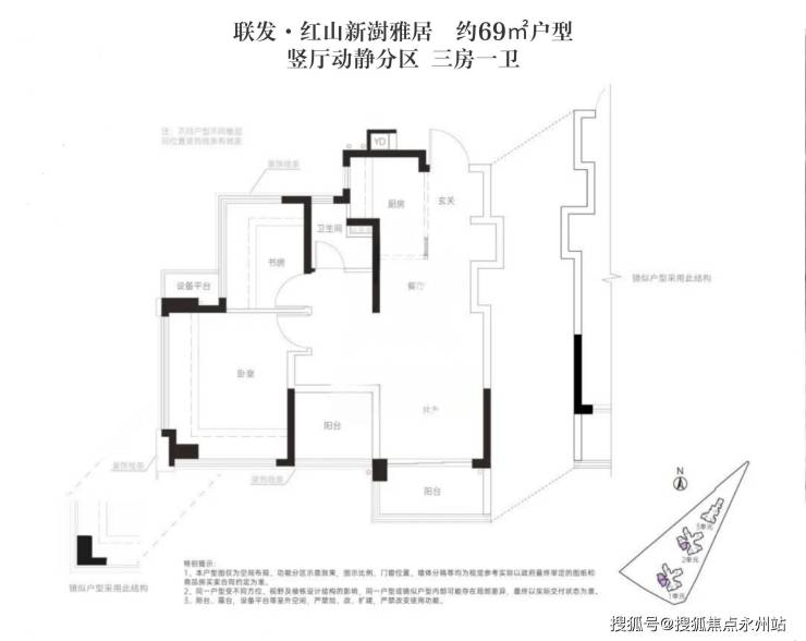 69㎡户型:极致三房设计,是项目的主打产品,共46套,采用竖厅设计,西南朝向。