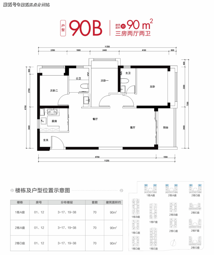 90㎡三房:898套(含97套无障碍户型),总价341万-410万。户型为大横厅设计(90B)或动静分区竖厅(90A),主卧套房配置飘窗,部分端头位户型采光通风更佳。