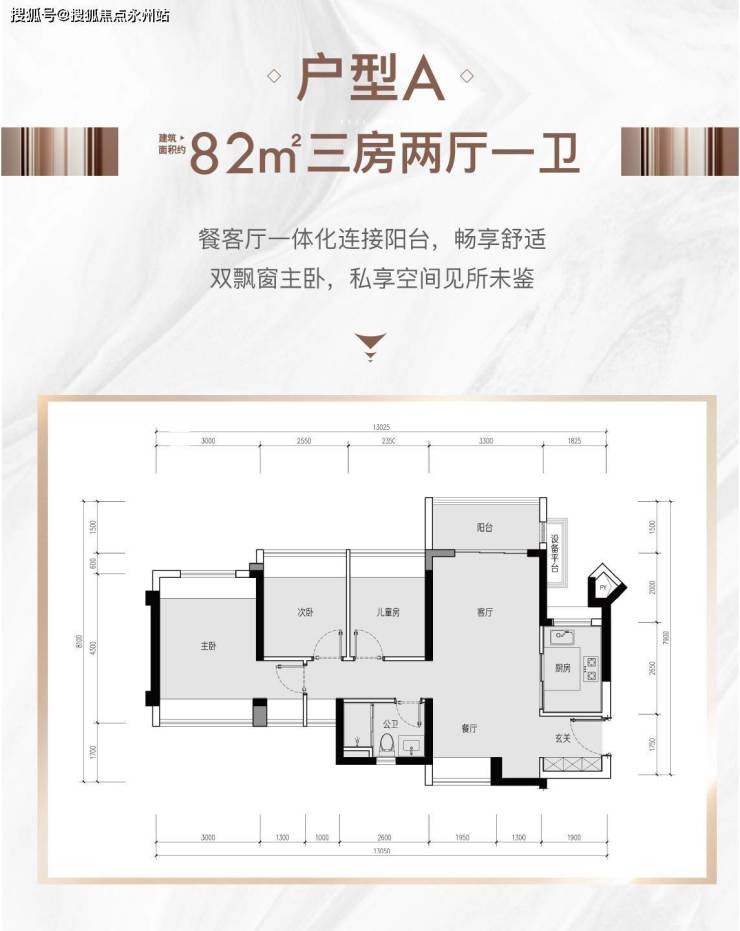 A户型-82㎡三房两卫:竖厅格局,动静分区,南北通透,客厅开间约3.3米,主卧开间约3米;阳台东北朝向,这个户型没有那么近高铁,受高铁噪音的影响可能比较小。户型分布:(1/3栋1单元05户型)