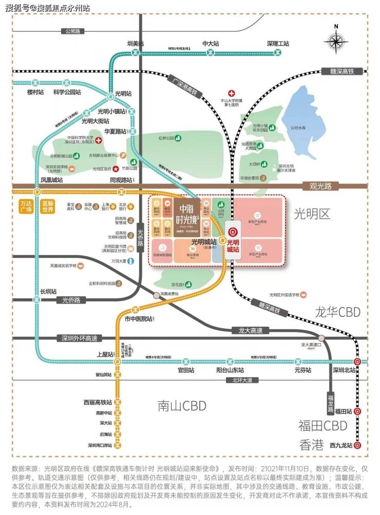 项目位于光明区凤凰城观光路与科林路交汇处,项目西侧挨着华润润曜府,东南侧是高铁光明城站,约1公里范围内涵盖有光明新城公园,网红点虹桥公园,百花园公园,距离光明城高铁站及13号线“光明城站”约200米。未来13号线还将在光明城站交汇,无论是去南山、还是深圳北站或者福田都会比较便捷