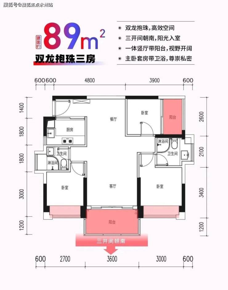 89㎡三房两卫:折后总价360万-383万元(单价约4.04万-4.3万元/㎡),东南朝向双阳台设计。