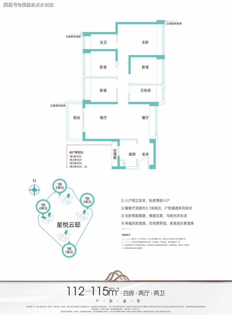112-115㎡的四室两厅两卫:竖厅通透格局,客厅开间3.7米,独立入户玄关,全屋设有飘窗。得房率高达78.16%(不含赠送),阳台主要朝向西北或东北。