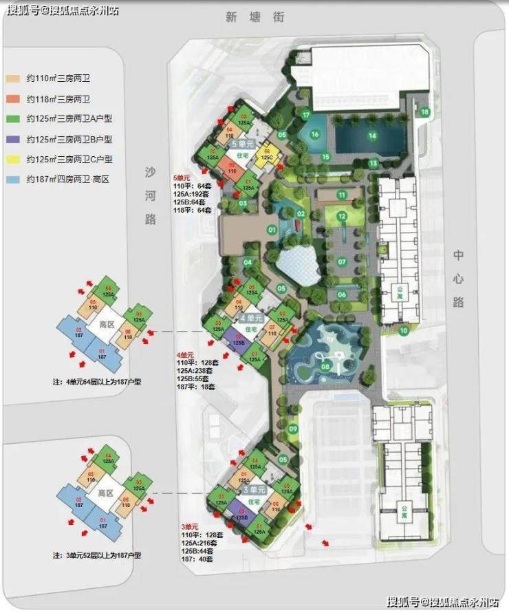 1栋3-5单元电梯分高低区,48以下为低区,以上为高区;3/4单元低区4梯7户,高区3梯6户,5单元低区3梯6户,高区3梯6户;标准层高3m,部分层高3.15m