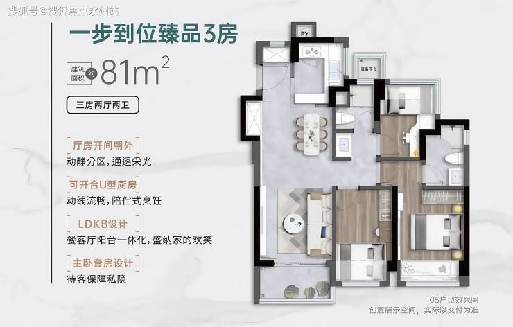 81㎡的3房2厅2卫,设计的是竖厅格局,客厅3.05米开间,LDKB一体化,S墙设计预留冰箱卡槽位,动静分区,U型厨房,卫生间三段式干湿分离还带1个设备平台,得房率约91%(包含赠送),实用面积约73.71m²,正东或正南朝向。