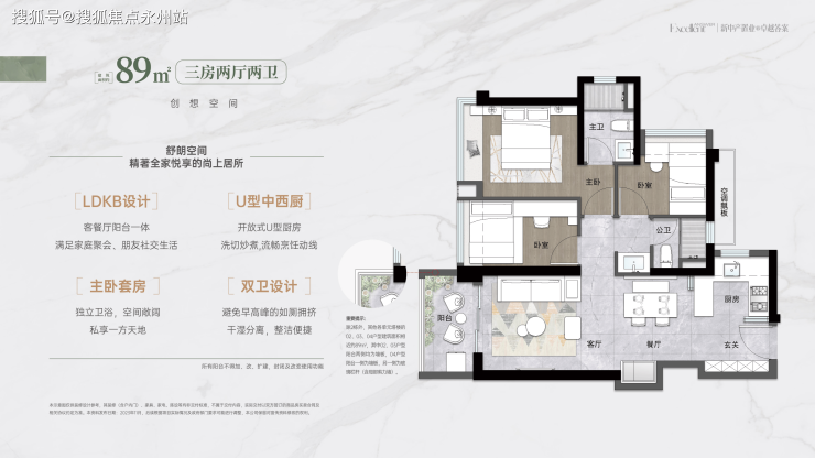 89平,南向阔绰三房(1栋1/2/3单元02/03/04户型、3/4/5栋02/03/04户型)竖厅格局,客餐一体,动静分区,S墙设计预留冰箱位,公卫三段式分离设计;02户型东南朝向,03/04户型西南朝向。