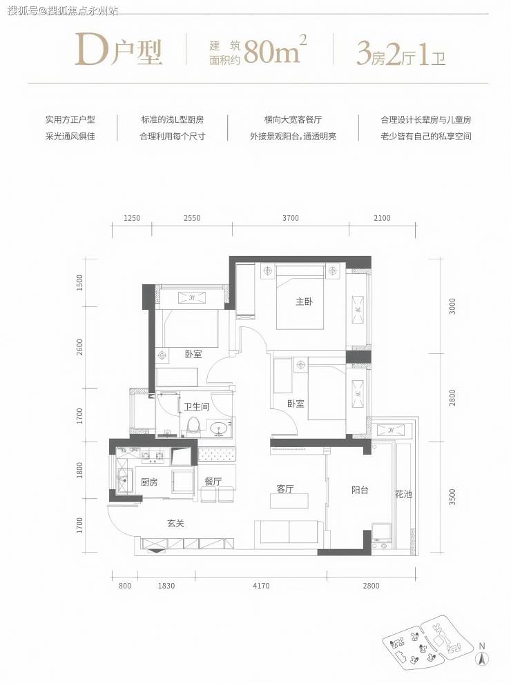 80㎡的3房2厅1卫,设计的是经典竖厅格局,客厅3.5米开间,进门玄关,LDKB一体化设计,动静分区,L型厨房,卫生间干湿分离,东向或西向。