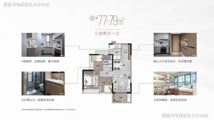 79㎡的3房2厅1卫,设计的是经典竖厅格局,进门入户玄关,客厅3.3米开间,LDKB一体化设计,动静分区,3个卧室分别做到了主卧10.89㎡/次卧5.85㎡/次卧5.73㎡(实测面积,去掉墙体),U型厨房,卫生间三段式分离,得房率约76.67-78.88%(不含赠送),西南、东南或西北朝向。