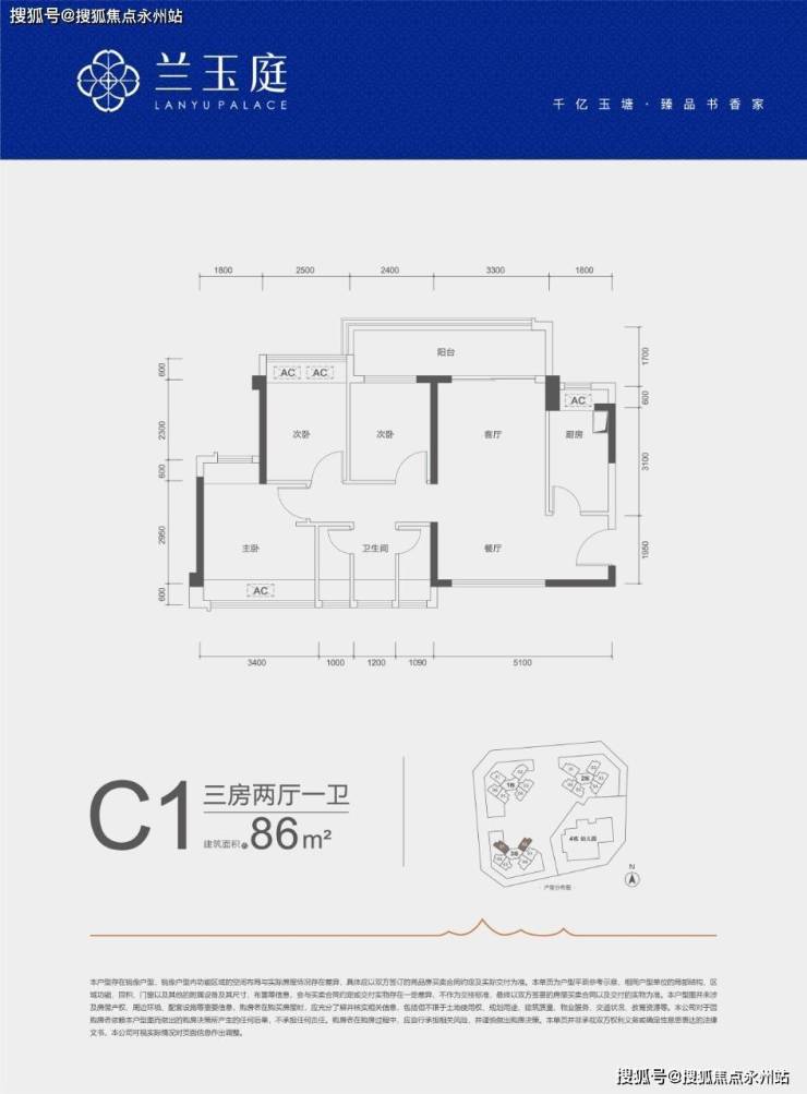 C1户型—86㎡的3房2厅1卫:设计的是竖厅南北通透格局,客厅开间3.3米,3个卧室分别做到了3.4米/2.5米/2.4米的宽度,客厅连接次卧出5.7米长的大阳台,L型厨房,创新式三分离卫生间,得房率约79%(不含赠送)阳台主朝西北或东北向。