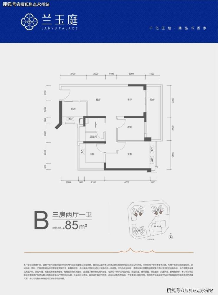 A户型—85㎡的3房2厅1卫:设计的是竖厅格局,客厅开间3.3米,LDKB一体化,三开间朝南,3个卧室分别做到了3米/2.8米/2.4米的宽度,客厅连接次卧出5.7米长的大阳台,L型厨房,得房率约79%(不含赠送),西南或东南朝向。