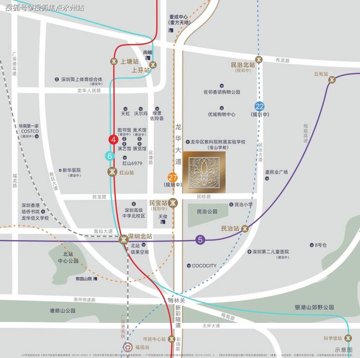另外,项目半径1公里范围内,拥有深圳地铁4/5/6号线的三个站点:深圳北站、红山站和民治站。未来还有规划中的地铁22号线民治北站和27号线民宝站。
