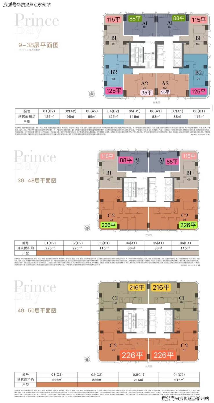 【太子湾•泓玺】总高194米,共1栋,分为顶高低三个区域,低区9-38层4梯8户,面积为88-95-115-125㎡;高区39-48层4梯6户,面积为88-115-226㎡;顶层49-50层4梯4户,面积为216-226㎡,