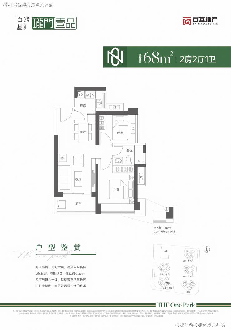 68㎡的2房2厅1卫,仅3栋1单元02户型,设计的是竖厅格局,客厅3.4米开间,LDKB一体化设计,L型厨房,卫生间干湿分离,东南朝向。