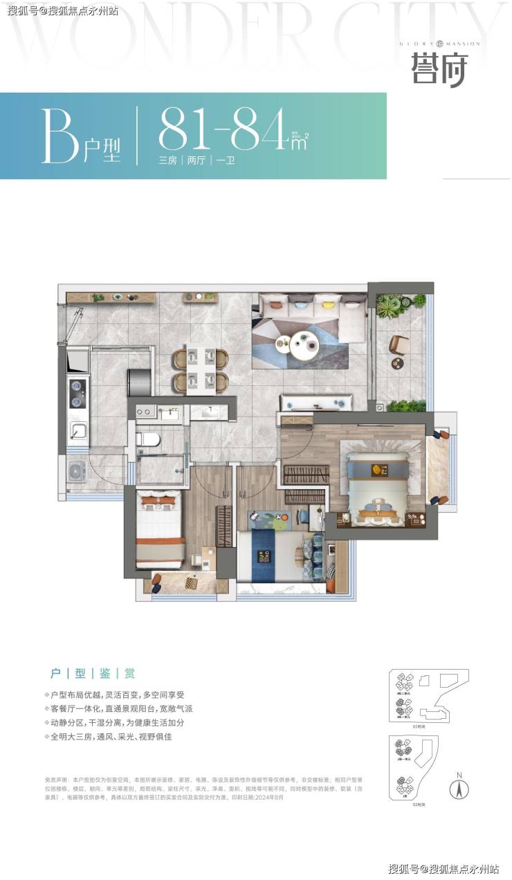 81-84㎡的3房2厅1.5卫,设计的是竖厅格局,客厅3.2米开间,一字型厨房还带一个小生活阳台,卫生间干湿分离,得房率74.4%(不含赠送),有西北、西南或东南朝向。