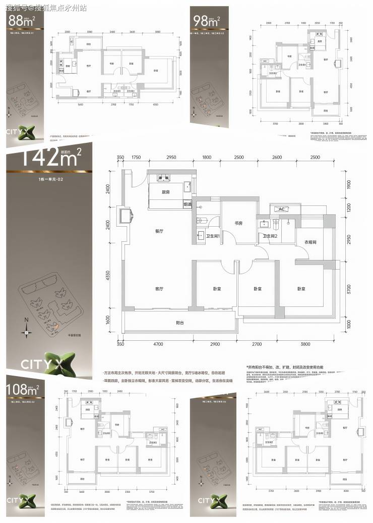 朝向:88㎡户型为西北或东北向,另外一侧有窗,但只有通风,没有采光和视野。98㎡和108㎡户型都有东南和西南两种朝向,117户型全部朝西南;143㎡只有1条腿,朝东南。