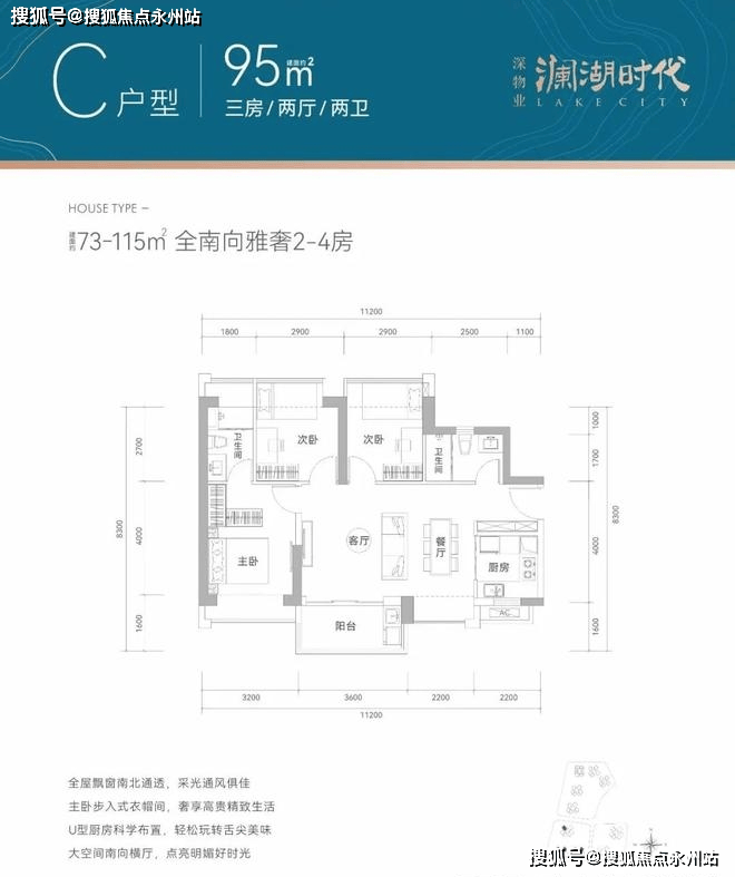 95㎡的3房2厅2卫,设计的横厅南北通透格局,全屋飘窗,U型厨房。