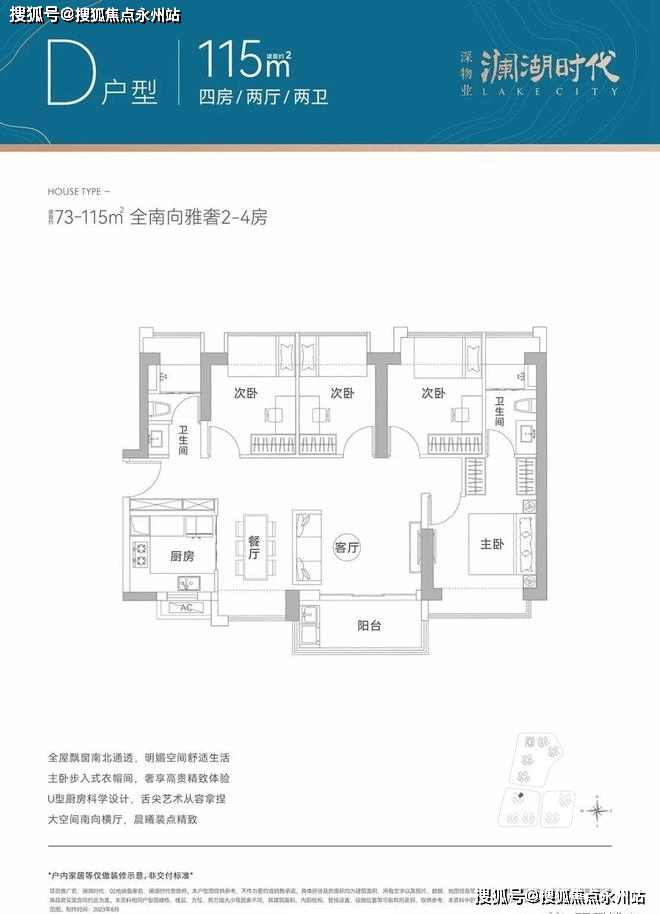 115㎡的4房2厅2卫,设计的横厅南北通透格局,全屋飘窗,U型厨房。