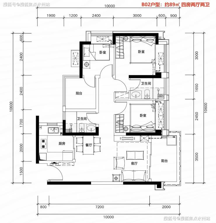 约89㎡四房两厅两卫:突破性实现四房布局,真正做到了“同等面积多一间房”,既保留了客餐厅的开阔尺度,又为二胎家庭或三代同住预留了充足空间,让成长型家庭无需为换房烦恼,一步到位实现“全生命周期居住自由”。
