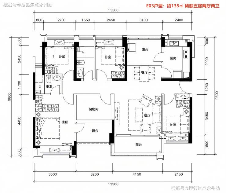 约135㎡五房两厅两卫:四开间朝南,将约2万㎡园林景观尽收眼底,双阳台与方正户型设计,让大宅生活的尊崇与舒适淋漓展现。
