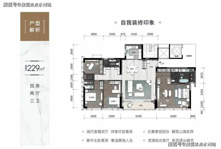 公寓229㎡4房2厅3卫:3.3米层高,6.7米客厅开间,舒适度高,配置较多落地窗,视野通透,空间敞亮感十足,可享受三重景观:山景、海景、城市景观,主卧大套房设计,十分奢华,户型灵动可变,实用型4房可变享受型双主卧3房