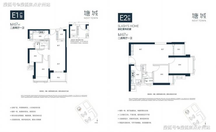 E1户型(东南向):竖厅设计,餐客一体纵深达8.5米,主卧带2.1米宽飘窗(赠送面积),L 型厨房预留双开门冰箱位,阳台进深1.5米可改造为书房。