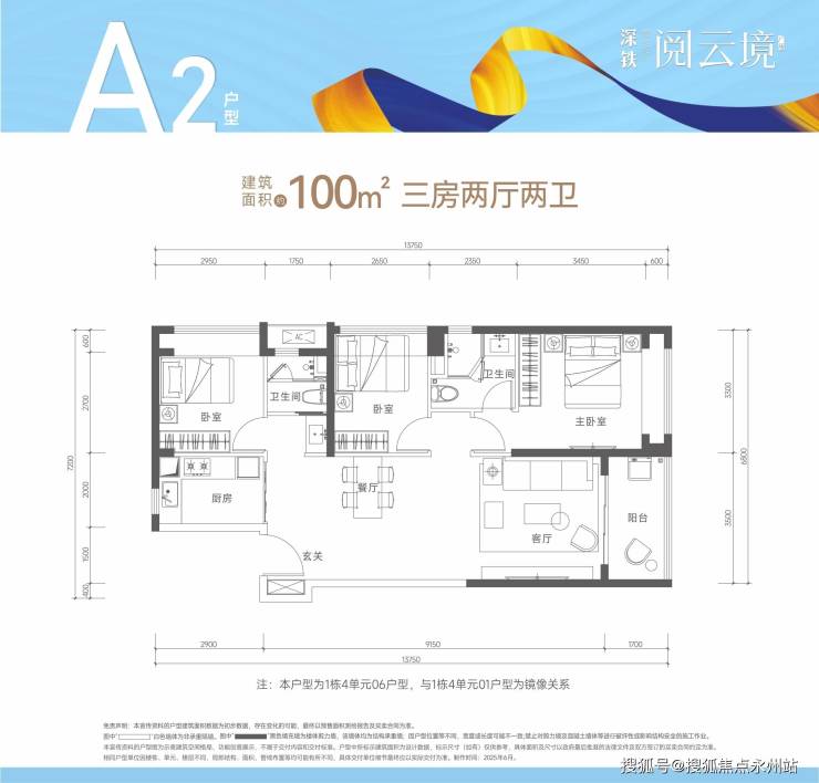 A2户型-100㎡三房两厅两卫,分布在1栋4单元01、06号房,为东向或西向,竖厅设计,功能分区明确。