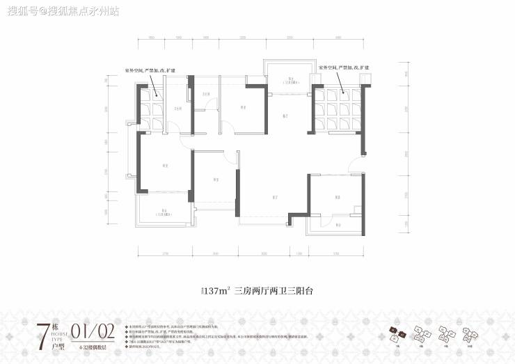 约137㎡三房两卫(7栋01/02户型)双龙抱珠格局,南北通透;奇数层客厅、厨房配有阳台,偶数层餐厅、主卧、厨房都配有阳台,