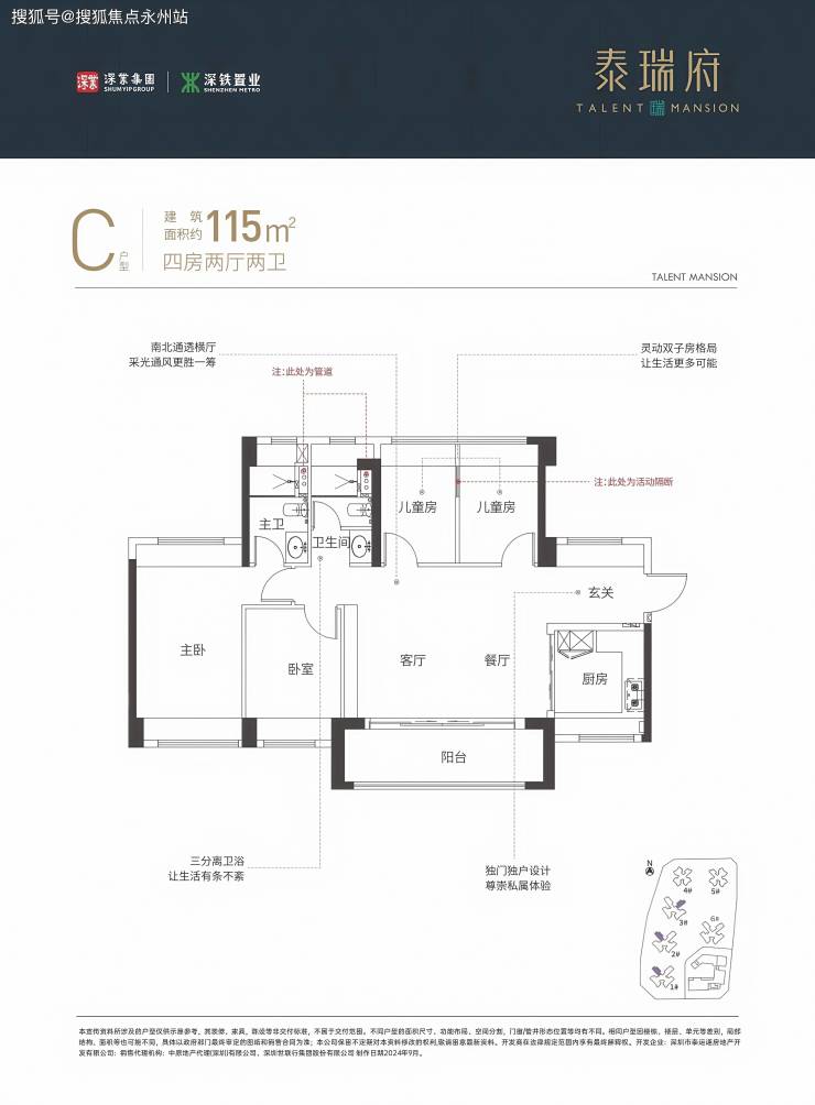 建面约115㎡4房2厅2卫(西南/东南朝向):客餐厅开间5.85米,四开间朝南,主卧南北通透带飘窗,公卫三段式分离。北向次卧可打通为书房或家庭活动室,满足多人口家庭需求,阳台主朝西南,中高楼层可俯瞰大运枢纽全景,对比前期楼栋优惠约14-19万。
