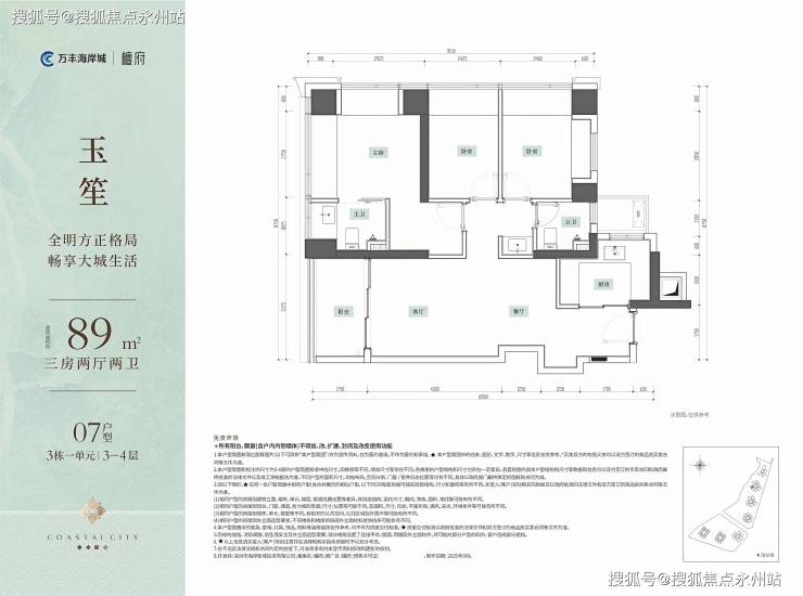89㎡3房2厅2卫,西南朝向,竖厅布局,卧室做了大面积凸窗赠送,同时主卧也算带独立衣帽间。