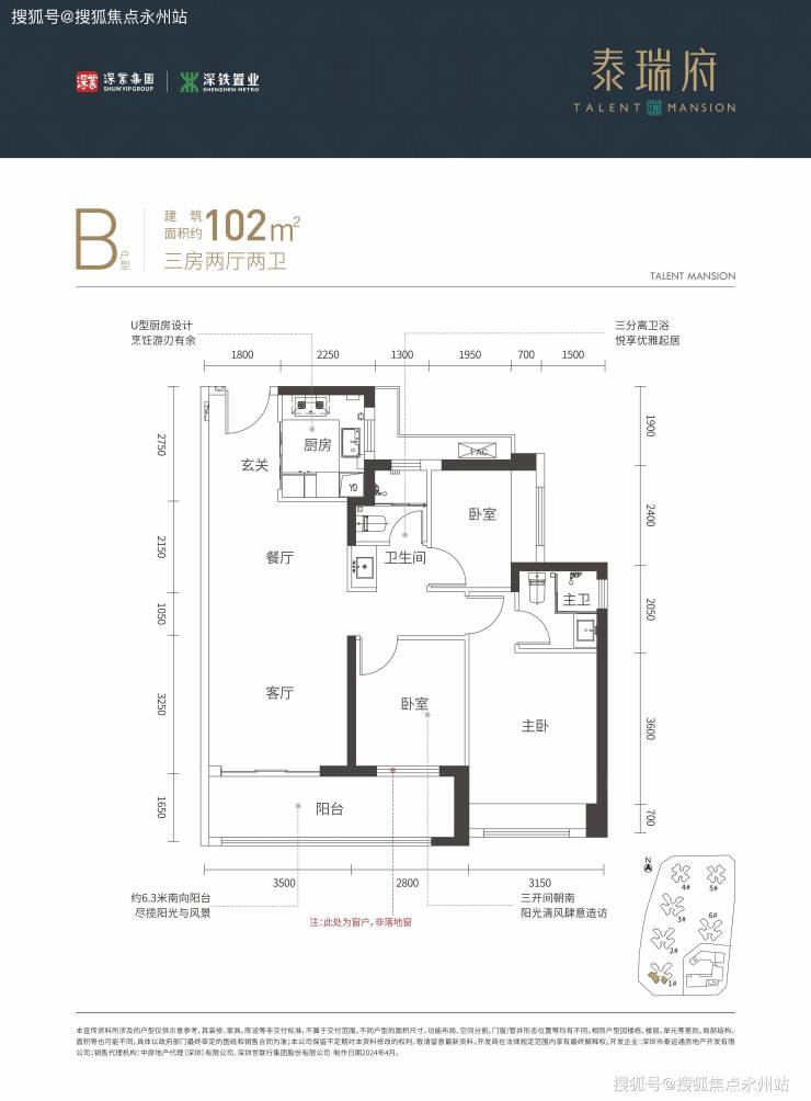 建面约 102㎡ 3 房 2 厅 2 卫:同样采用竖厅设计,客厅开间3.5米,三开间朝南,卧室尺寸分别为3.15米、2.8米、2.65米,6.3米长阳台连接客厅与次卧,U 型厨房搭配三段式分离卫生间,西南或东南朝向可选。