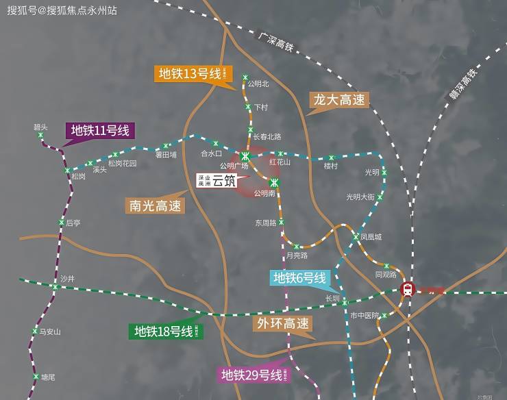 深业云筑,位于深圳市光明区公明街道马田街道石家社区,地处光明科学城大科学装置区,是粤港澳大湾区核心区域及广深科技创新走廊重要节点,承接南山区科技外溢,毗邻东莞松山湖,区位优势显著。项目紧邻地铁6号线公明广场站(1.1公里)及在建13号线公明南站(约700米),未来可直达南山科技园、后海总部基地;周边龙大、南光高速无缝衔接福田、南山,交通便捷