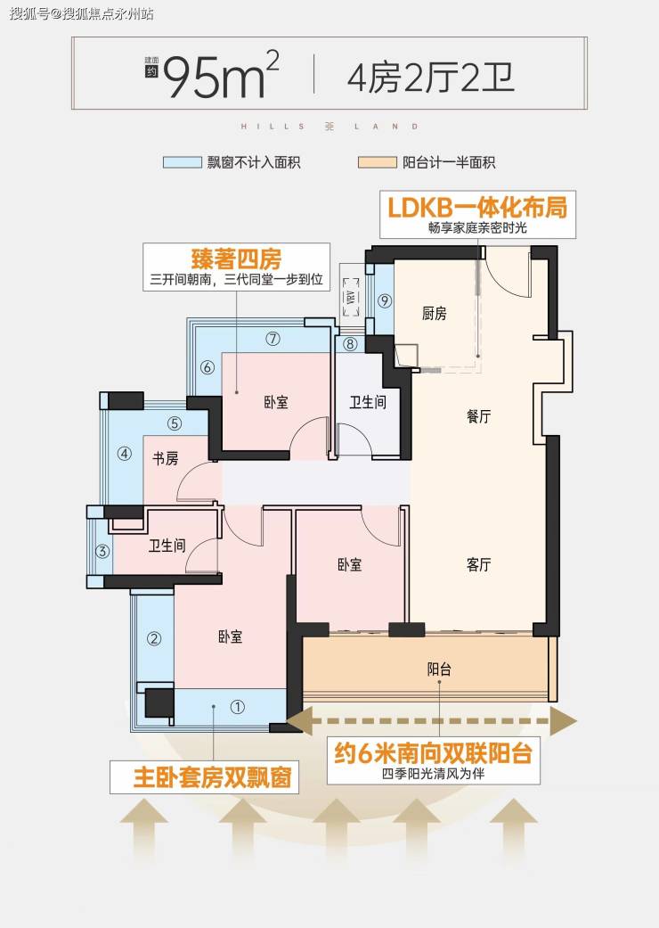 95㎡四三房二厅二卫:竖厅户型,四房大阳台,尺度上也基本满足了,唯一一点就是主卧背靠凸窗衣柜是需要一个接受的过程。