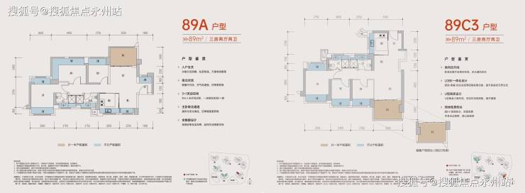 建面约89㎡三房两厅两卫(竖厅/横厅可选)