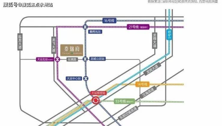 泰瑞府与地铁16号线【龙城公园】站及在建的深惠城际的【大运北站】直线距离约600米。16号线可以2个站换乘大运综合交通枢纽的3号线及14号线,链接罗湖及福田区。