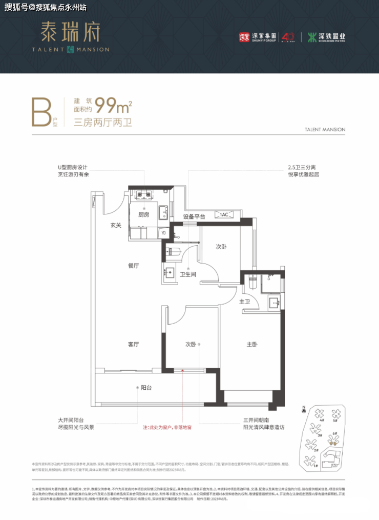 99㎡的3房2厅2卫;设计的是竖厅格局,进门入户玄关,客厅3.5米开间,三开间朝南,3个卧室分别做的3.15米/2.8米/2.65米的宽度,客厅连接次卧出6.3米长大阳台,U型厨房,卫生间三段式分离,得房率:79.23%(不含赠送),有西南朝向或东南朝向。