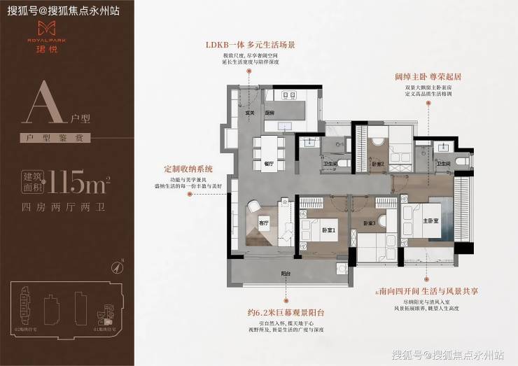 115㎡四房:四开间朝南,6.2米巨幕阳台,主卧双飘窗,南北通透,总价约828 万起。